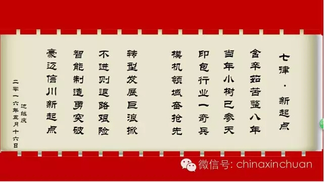 邊繼慶董事以一首《七律▪新起點》揭開瞭信川機械八周年的序幕。八年的風風雨雨,八年的筚路藍縷,至2016年5月16日,山東信川機械有限責任公司已成立八周年。在此佳日,捷報頻傳,落戶煙台的信川機械智能聯動線平穩過渡試運行階段,正式投入生産使用!這意味著八年後的今天,信川機械轉型升級爲制造業服務企業,也昭示著信川機械在印後智能聯動線領域的領導者地位!